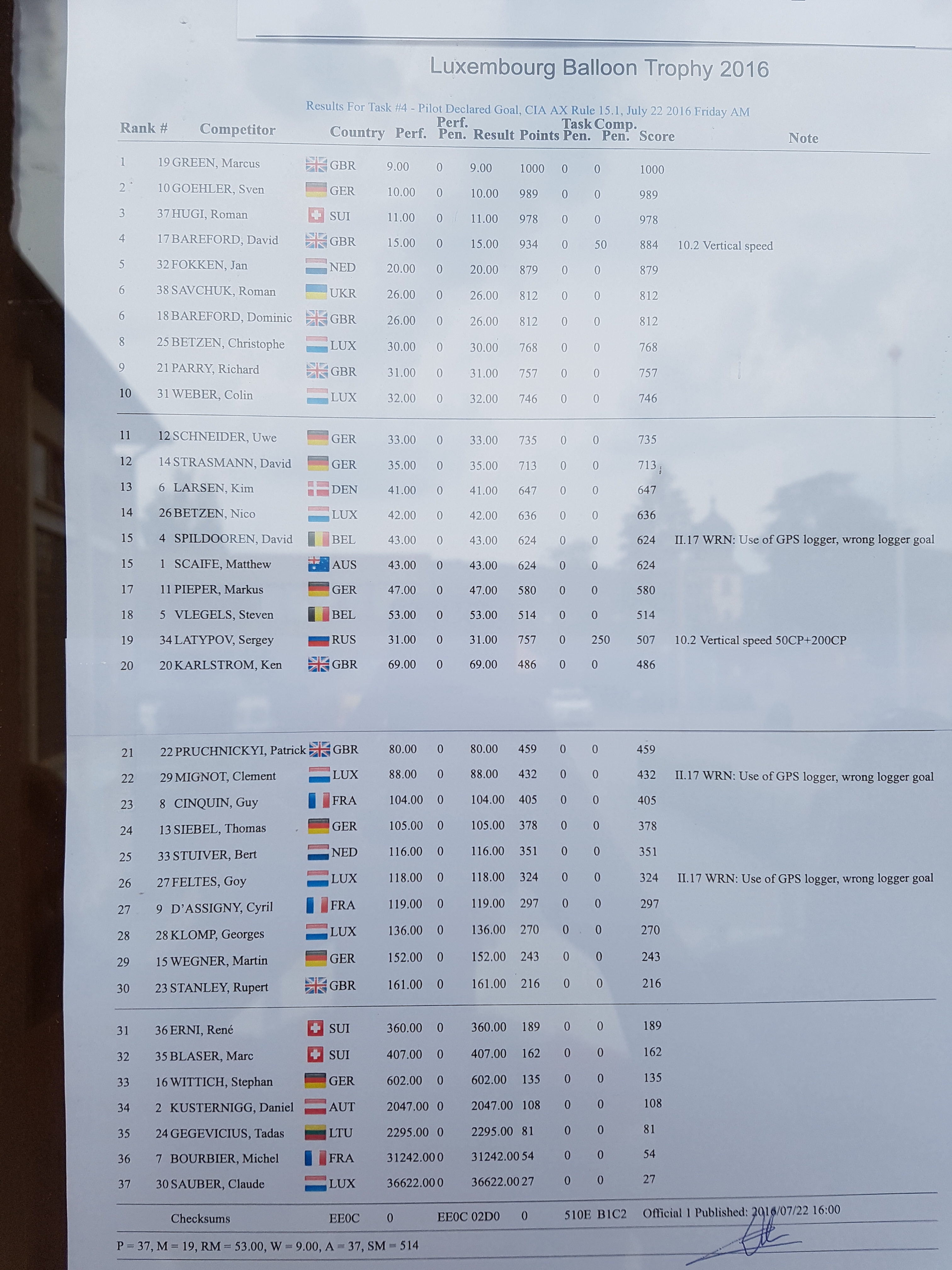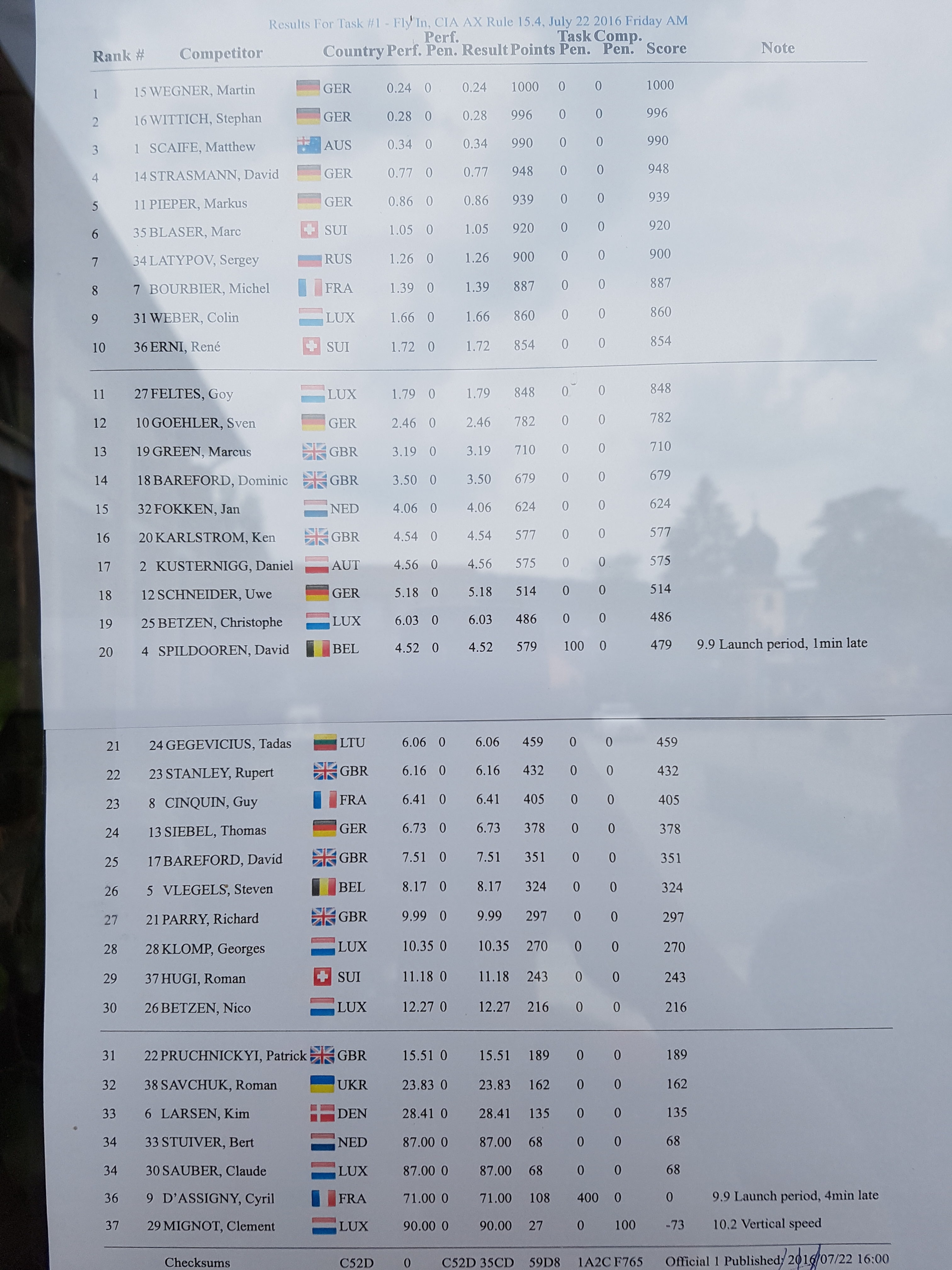 FIN, WSD, HWZ und PDG galt es zu absolvieren. Beim Fly In sank ich zu spät ab. Der Marker landete zwar noch deutlich in der MMA, auf diesem Niveau wird das aber ein Resultat ganz hinten im Feld. Das PDG durften wir am Boden definieren und danach maximal zwei Mal in der Luft umdeklarieten. Der Deklarationspunkt musste mindestens 20 Minuten vom Loggermarker entfernt liegen. Das ist etwas ungewohnt da üblicherweide eine Distanz definiert ist. Ich setzte am Boden ein PDG zwischen FIN und HWZ. Die Anfahrt bei gut 20 km/h gelang sehr gut. Das sollte ein Resultat ganz vorne werden. Beim HWZ kamen mir einige Ballone in den Weg. So entschied ich mich zu einem höheren Markerabwurf. Dieser gravity drop dürfte irgendwo im Mittelfeld liegen. Die Fuchsjagd, mittlerweile zu einer meiner Lieblingsdisziplinen mutiert, gelang wieder sehr gut. Ich warf den Marker etwas zu weit über das Kreuz. Die geschätzten zwei Meter sollten einige Punkte bringen.